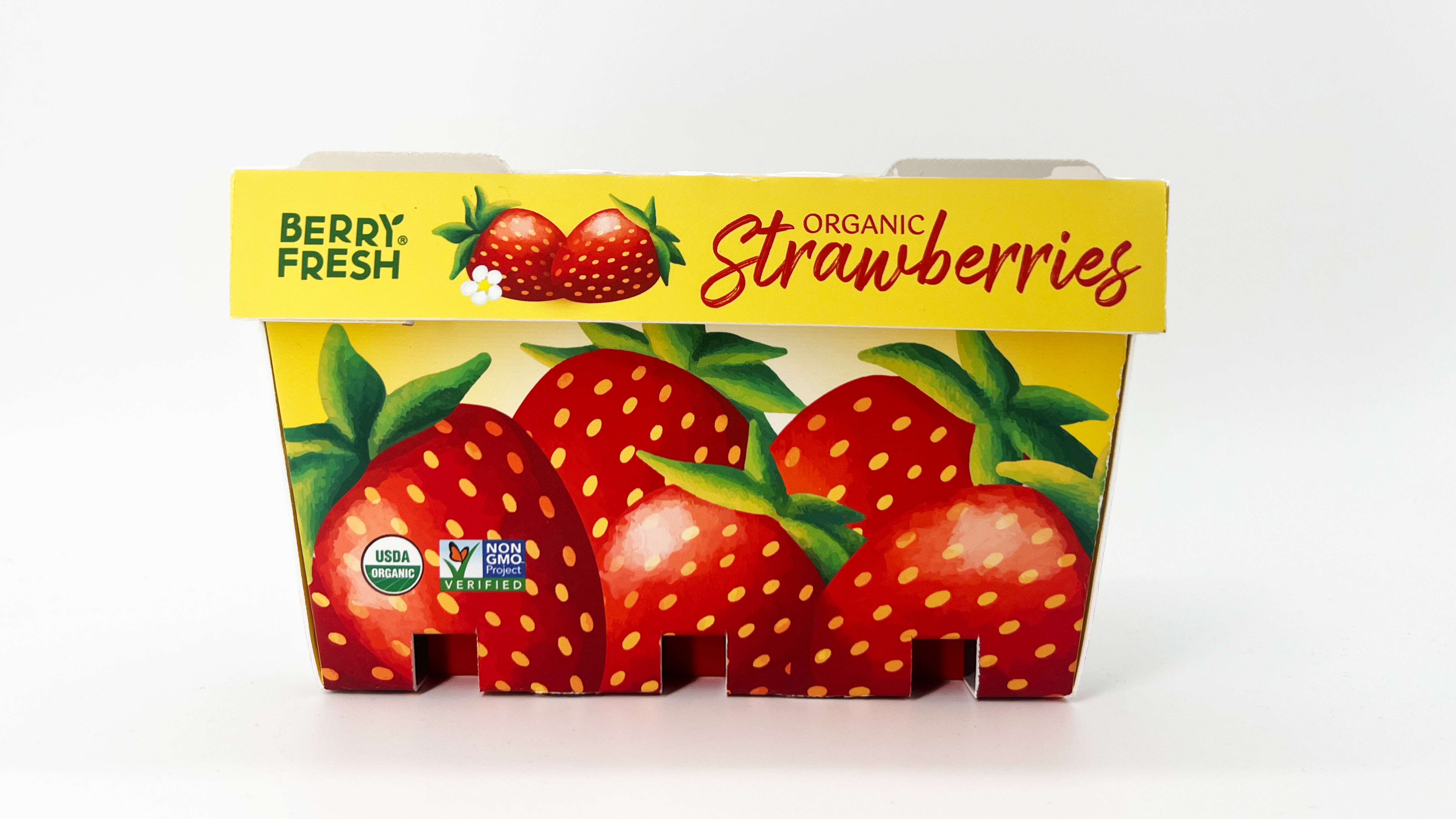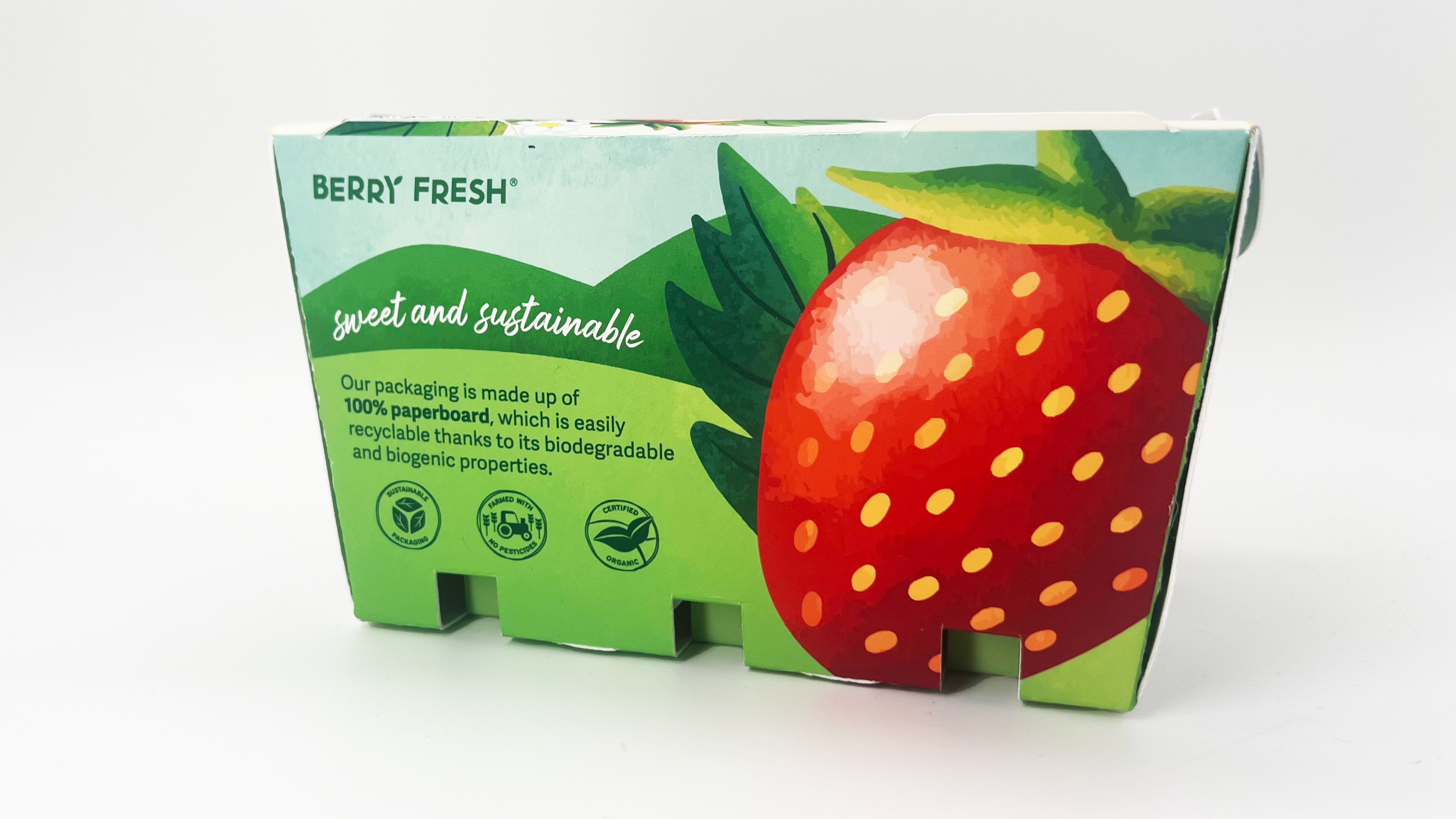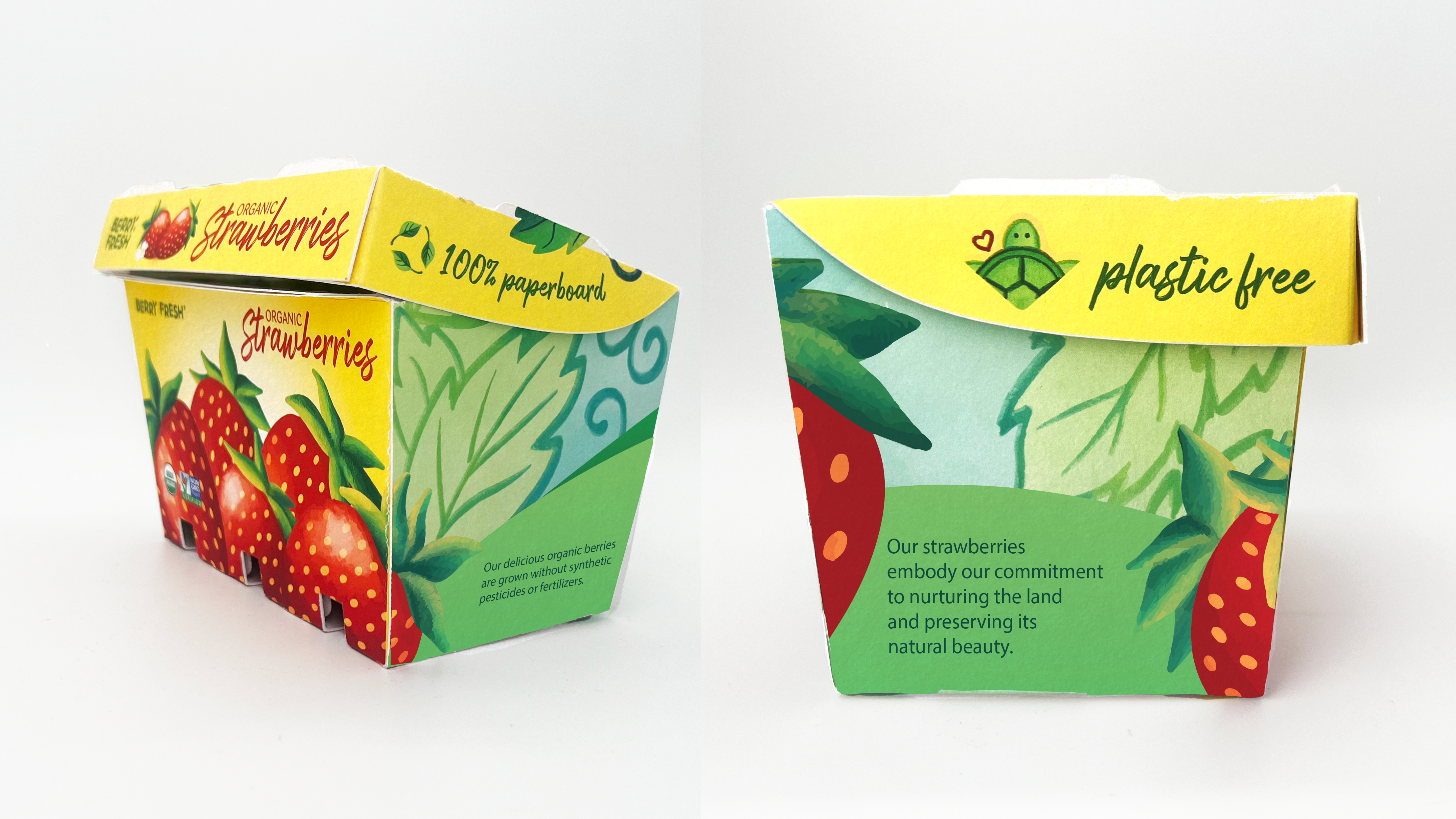 This project was created by a team of ITP (Industrial Technology and Packaging) and Graphic Design students. It is sustainable, 100% paperboard packaging designed to replace plastic clamshell packaging in grocery stores.