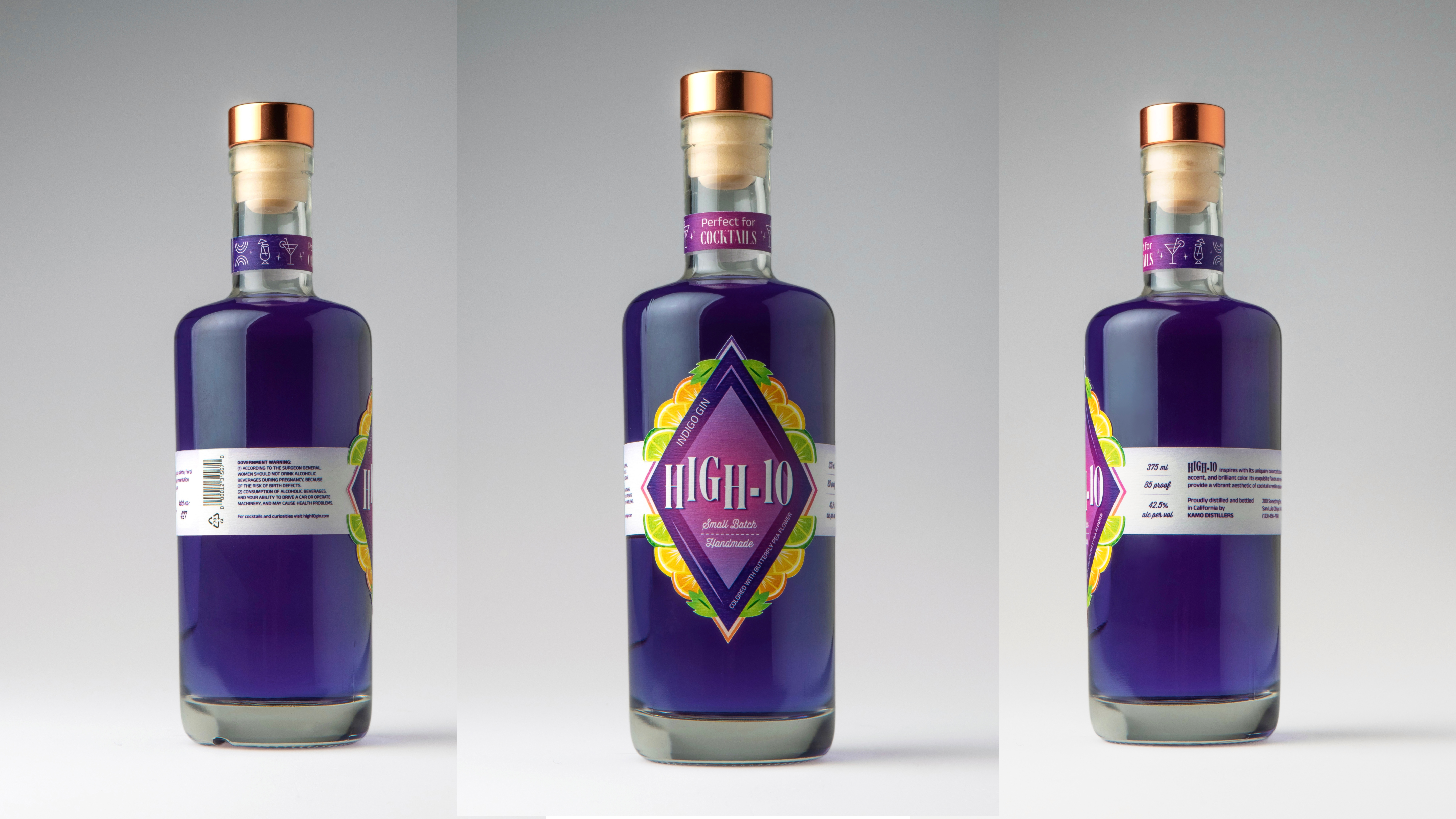 High-10 is an indigo gin that achieves its beautiful purple hue from butterfly pea flowers. It is curated to create elegant and colorful cocktails.